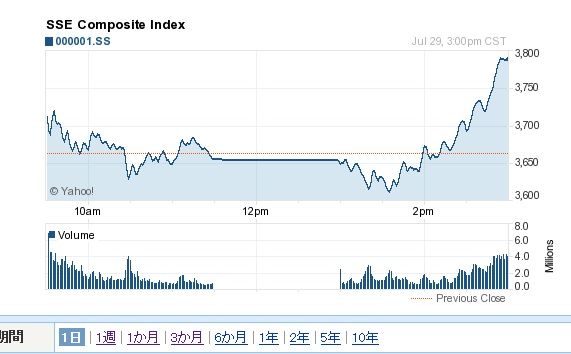 上海総合指数 は前日比3.4%高の3789.17で終了。前日までの3営業日では11%下落していた。指数は取引終了前の1時間で1.4%の下げを消した。