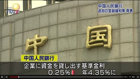 中国の中央銀行「中国人民銀行」は23日夜、24日から政策金利をこれまでより0.25%引き下げるなどとする追加の金融緩和策を発表しました。中国経済の減速が鮮明になるなか、景気下支えの姿勢をさらに強めるねらいがあるとみられます。「中国人民銀行」は23日夜、金融機関が企業に資金を貸し出す際の基準金利をこれまでより0.25%引き下げて年4.35%に、預金の基準金利もこれまでより0.25%引き下げて年1.5%とし、24日から実施すると発表しました。