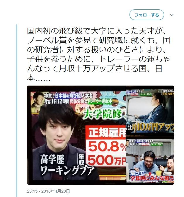 この方がどれくらいの成果を出しているかわからないので、何とも言いにくいけれど、研究者の給与の低さは昔から問題になってるよな。
