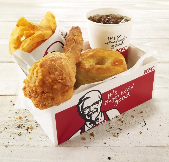 セット内容は、定番の「オリジナルチキン」1ピース、ホクッとした食べごたえと表面のカリッとした食感の2つが楽しめる「カーネリングポテト」(S)1個、外はサクサク、中はふんわりとした食感の、
