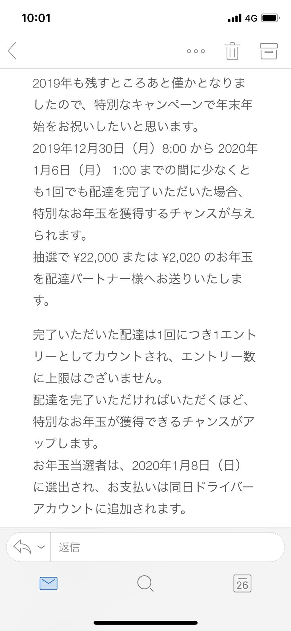 これ、何かというと年末年始の期間、1配達ごとにお年玉2020円か20200円をもらえるチャンスがもらえるものらしい。