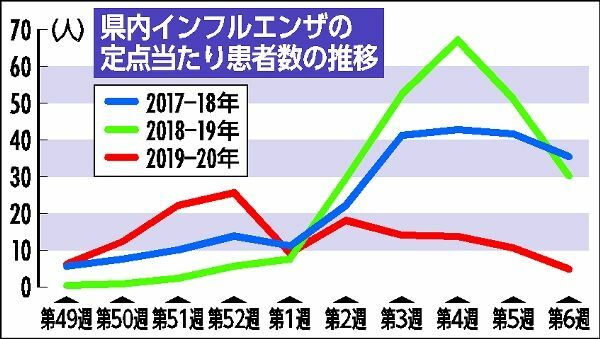 1月末~2月上旬は例年流行のピークに当たるが、県健康増進課は「コロナウイルス対策を徹底していることが要因ではないか」と推測。