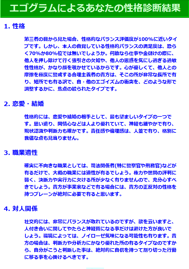 >宗教家、カウンセラー、医師、看護婦、教師など人間愛が基本となる職業以外なら、どんな職業にでも一応の性格的適性は有るでしょう。
