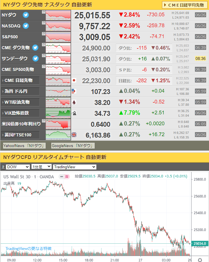 米株「ダウ -730感染再拡大 規制強化」