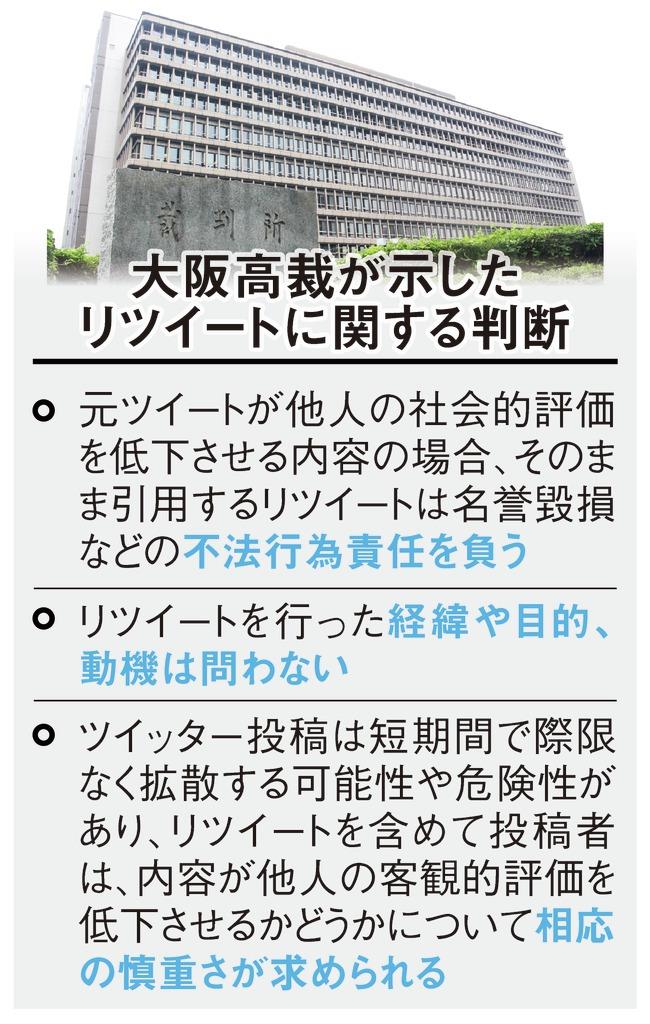ツイッターには他人の投稿を転載する「リツイート」と呼ばれる機能がある。拡散や共有、応援などさまざまな目的があるとされるが、一部のリツイートをめぐり、法的責任を問うケースが相次いでいる。元大阪府知事の橋下徹氏がジャーナリストを相手取った訴訟では大阪高裁が6月、昨年9月の1審に続き名誉毀損(きそん)を認定。高裁は「経緯や動機を問わず、リツイート主は投稿の責任を負う」と具体的に明示した。専門家は「安易な情報拡散に警鐘を鳴らす判断だ」とする。(杉侑里香)
