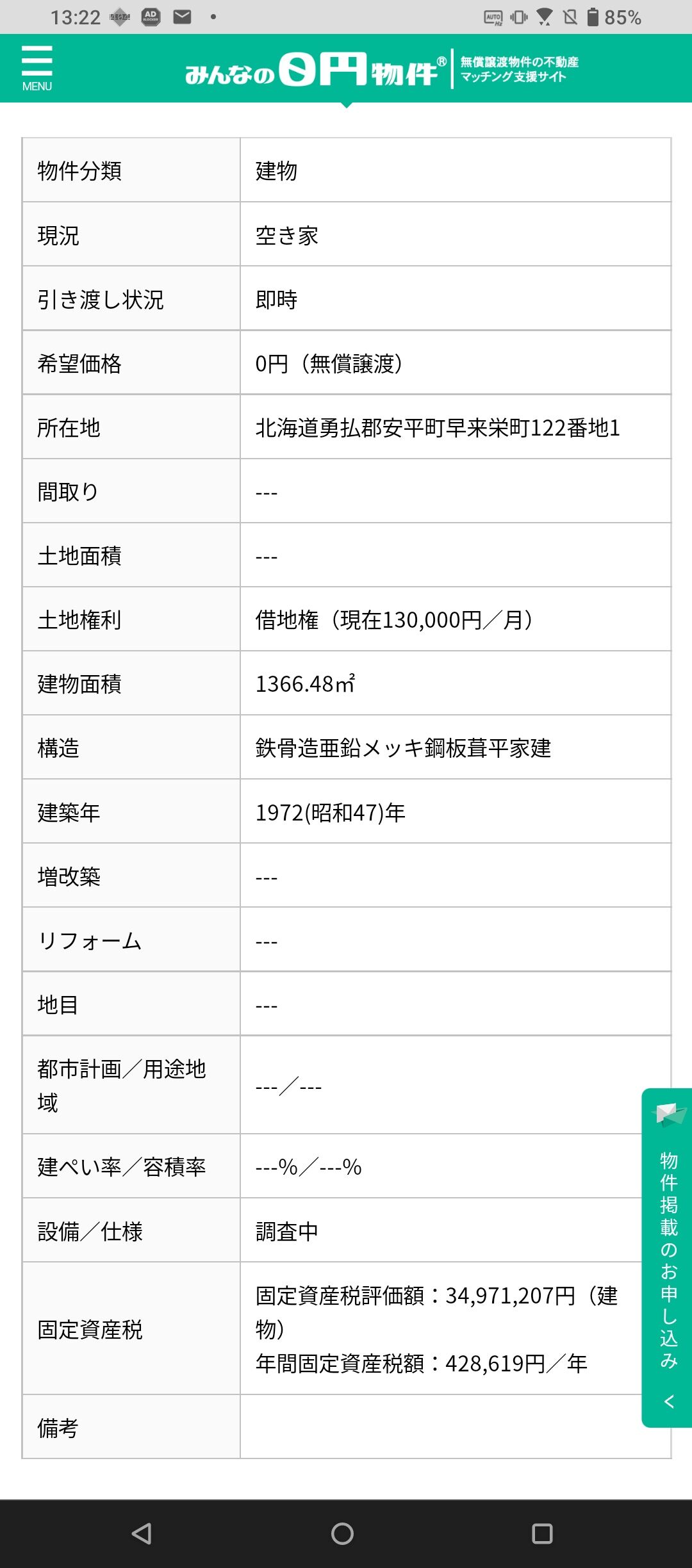 建物は0円だけれど土地のレンタル料が13万円/月かぁ。
